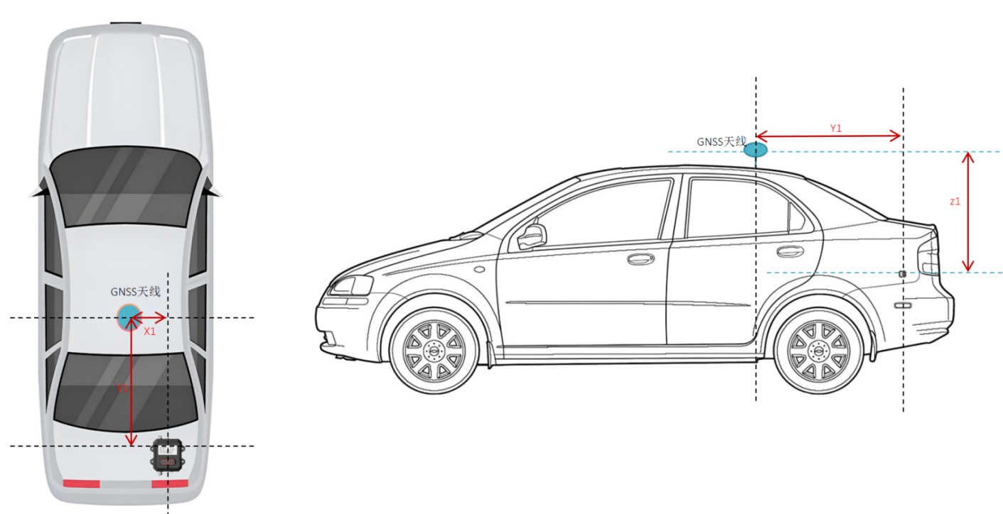沿整机坐标系 X 轴方向,测量天线几何中心到整机导航中心的距离,得到 X1 Offset;