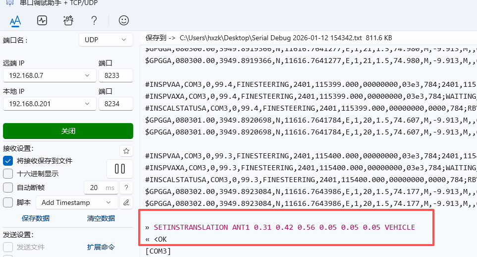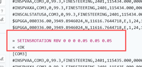 发送:SETINSTRANSLATION ANT1 0.31 0.42 0.56 0.05 0.05 0.05 VEHICLE